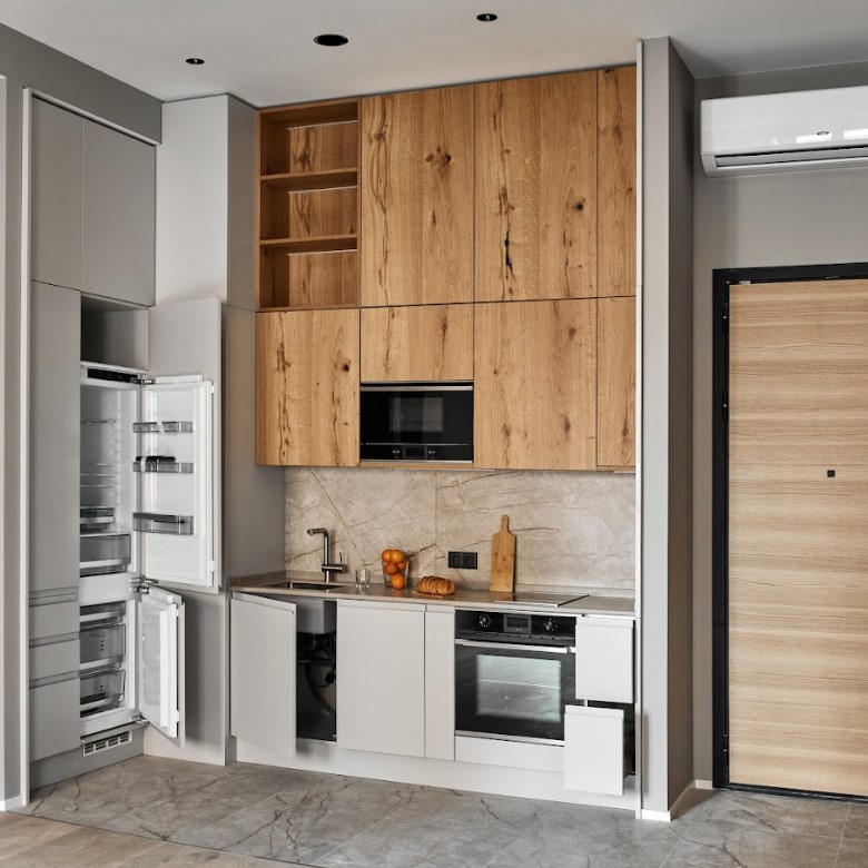 "Maria" offered Samolet’s customers kitchen models in three configurations: standard, comfort, and business. They differ in design, materials, class of appliances, and components. The furniture is complemented with everything necessary. The set includes: a sink and faucet, an induction hob, an oven, a hood, a built-in refrigerator, and a dishwasher. Thus, the client moves into a finished apartment with installed furniture and connected appliances.