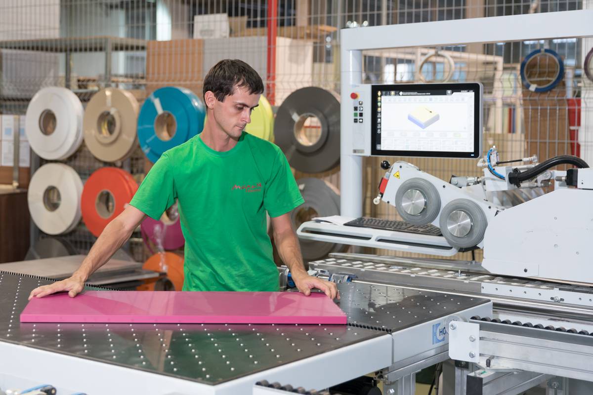 На станке Holmza (Германия) лист ДСП распиливается на части нужных размеров. Оборудование управляется компьютером — погрешность при раскрое минимальна. Материал располагается на воздушной подушке, которая защищает его от царапин.